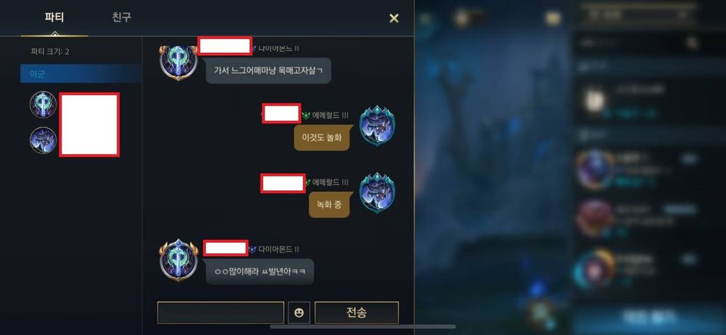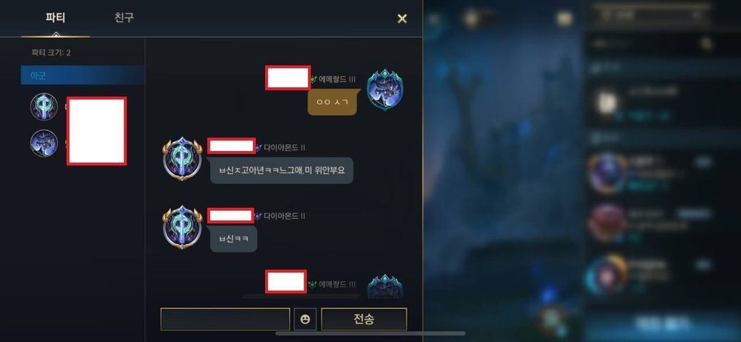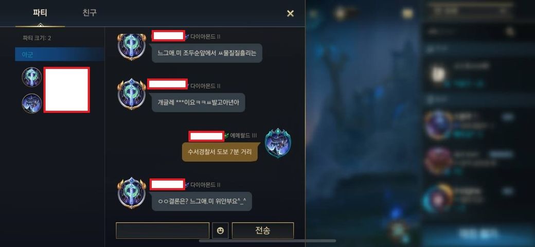 안녕하세요. 모바일 롤 (와일드 리프트)에서 게임을 하는 중에서 부모님에 대한 성적 욕설을 들었습니다. 위안부까지 언급하면서 욕설을 하네요. 거기에 그치지 않고 파티에 초대하여 끝없이 성적 욕설 (어머님에 대한)을 지속하였습니다.