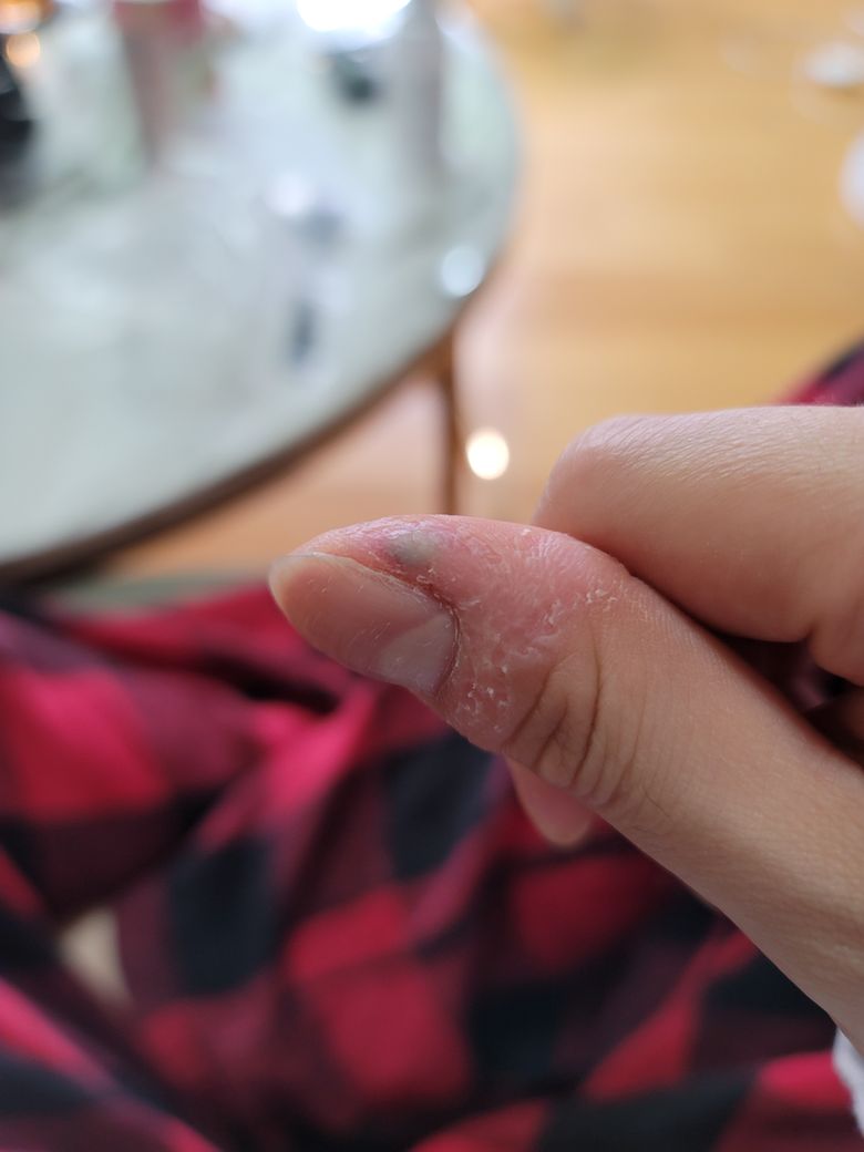 손가락을 펜치에 찝혀서 안에서 출혈이 발생한 것 같은데, 부상 당일엔 표피가 새하얗고 안에 붉은 피가 고인 형태였으나, 자고 일어나니 검게 변해있습니다.