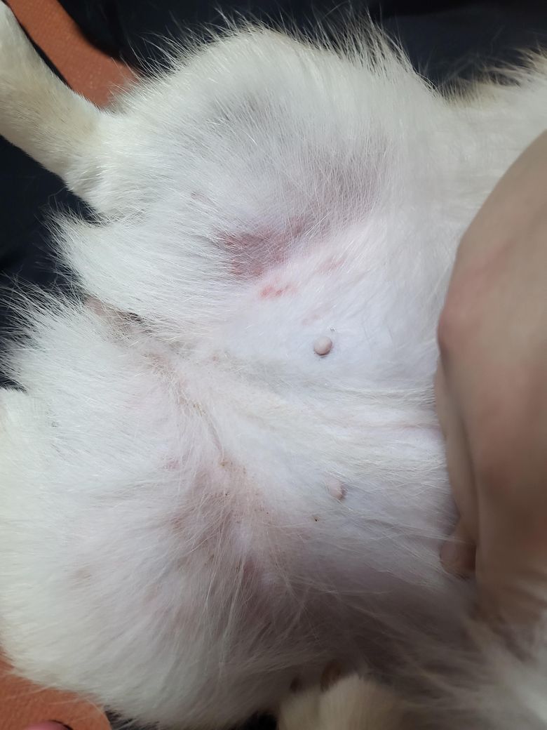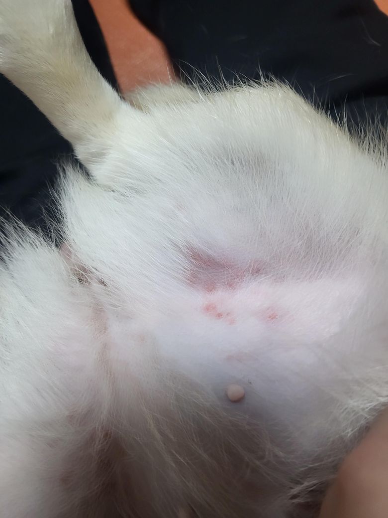 배쪽 양 다리 사이에 이런게 났는데 이게 뭘까요..??ㅠㅠㅠ 간지러운지 자꾸 긁어요. 발바닥도 빨개요 ㅜㅜ 무슨 문제인지 알 수 있을까요?