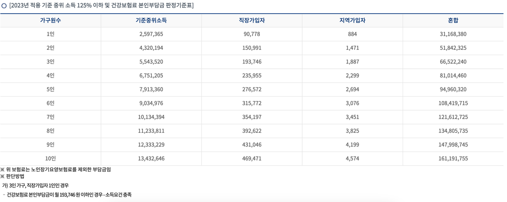 그럼 사진처럼 5인 가구이고 직장가입자 기준 월 납부액이 적으니 중위소득 125% 안에 해당되는 것 맞죠?