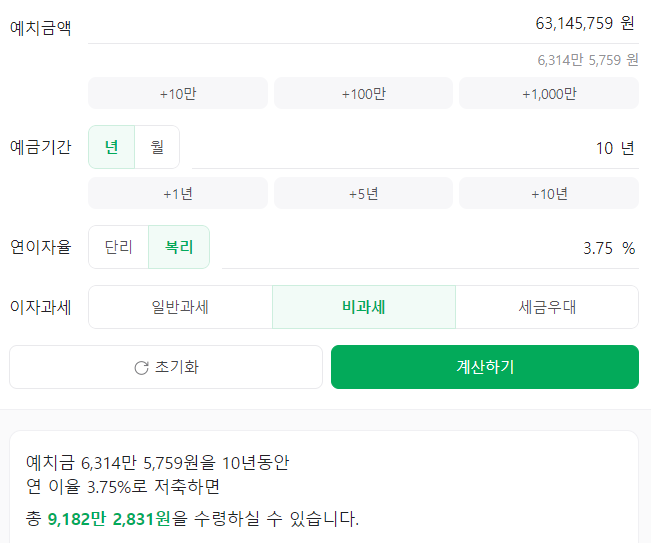 그런데 복리 3.75% 비과세 상품으로 알고있는데 네이버 예금계산기와 금액이 너무 차이가나서 왜이렇게 차이가나는건지 계산을 잘못하고 있는것인지가 궁금합니다.