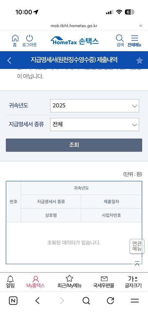 지금 다니고 있는 현직장에서 연말정산에 필요한 서류로 전직장 원천징수를 말하셔서 찾아보니 홈택스에 저렇게 조회가 되지 않는 상태입니다..
