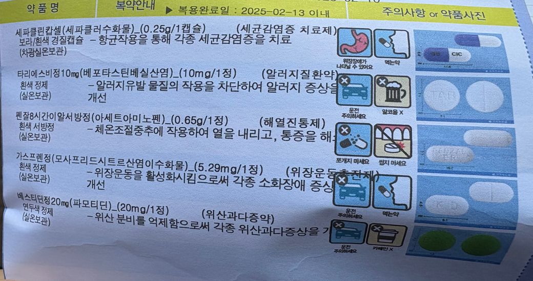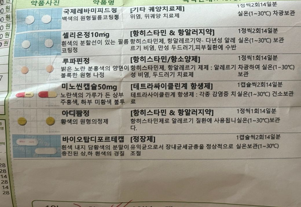 이외에 다른 약은 병용은 가능하나 항생제가 미노씬과 세파클린 2종류로 위장에 부담이 갈 수 있어 주의가 필요합니다.