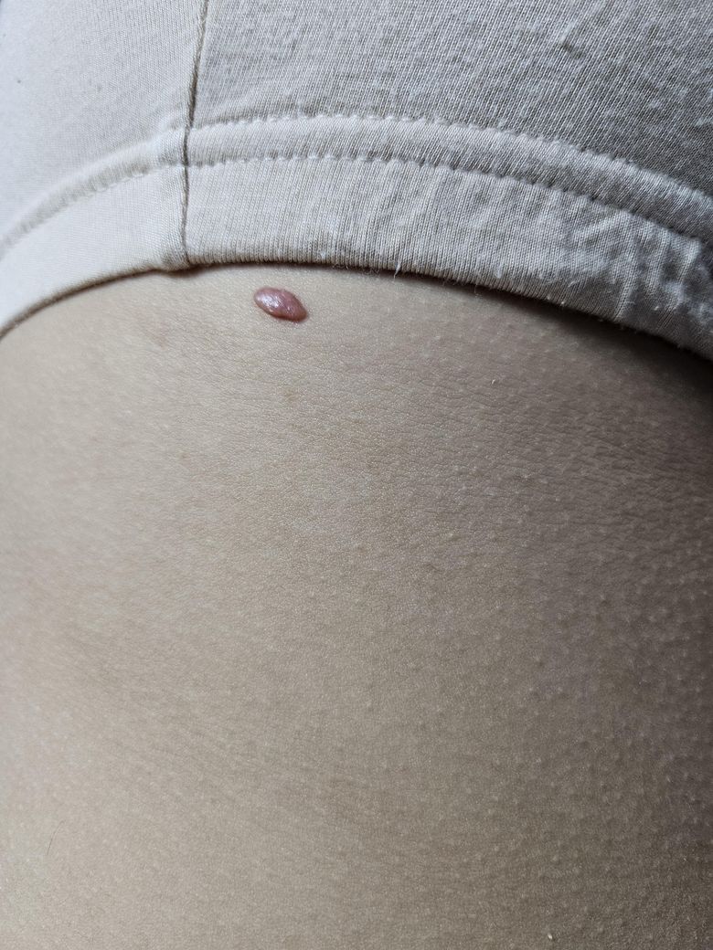 모반(점)과 같은 병변이라 추정되는데, 위치가 속옷에 닿아 불편감을 유발한다면 제거를 고려하는게 좋겠습니다. 가까운 피부과를 방문해보시기 바랍니다.