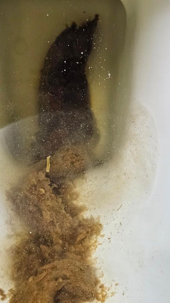 사진과 같이 변 주위에 하얗게 뿌연 물질이 보입니다. 시간이 지나면 풀어져서 잘 안 보이고, 따로 물 표면으로 떠오르거나 하지는 않고 그냥 물 안쪽에 있습니다. 변도 떠오르지는 않고, 끝 쪽이 약간 무른 편이에요. 혹시 이것도 지방변이라고 볼 수 있을까요?