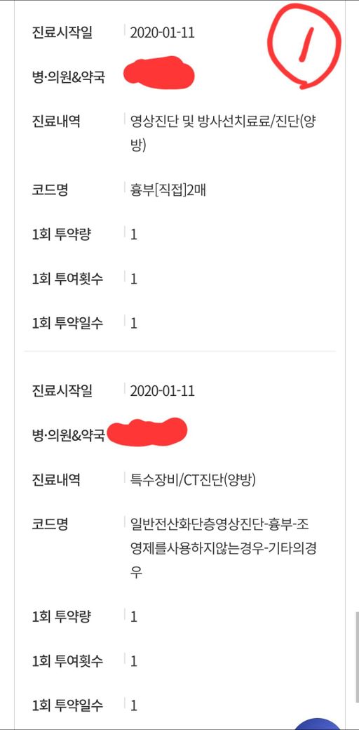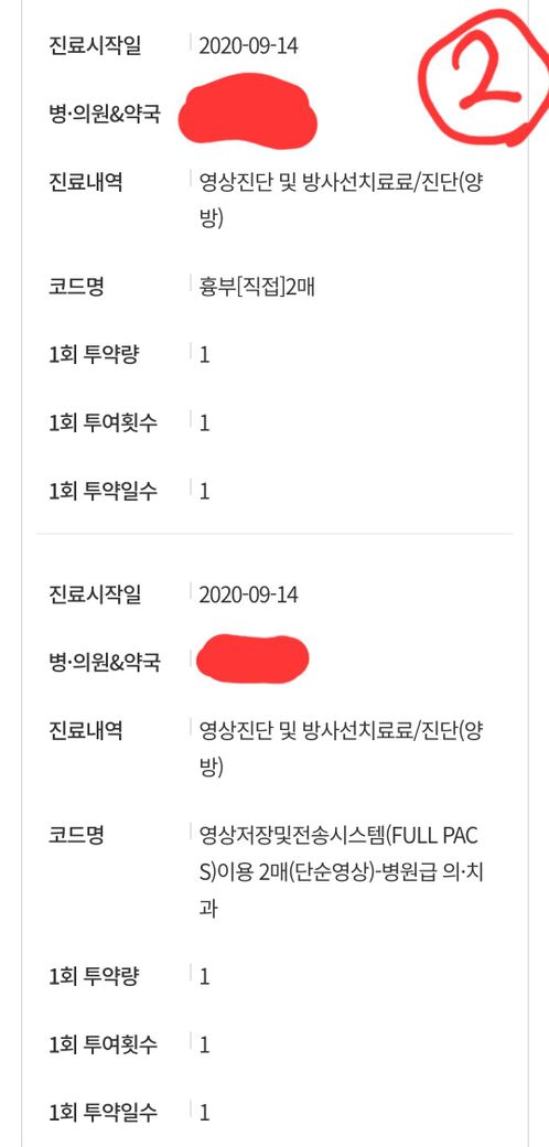 아래 두장의 사진은 '건강보험심사평가원' 에서 제공하는 제 진료기록중 일부를 가져온 것 인데요, 이게 정확히 한번 했다는 건지 각각 한번씩 총 두번 했다는 건지 분간이 잘 안가서 질문드려봅니다.