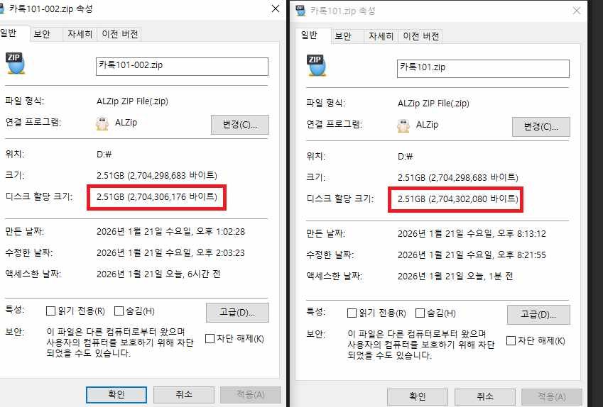 동일한 파일인데 '크기'는 같지만 '디스크 할당 크기'가 미세하게 다른데 파일이 깨지거나 오류가 발생한건가요?