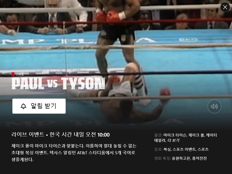 세계 권투사에 빛나는 핵주먹 58세 마이크 타이슨과 2000만 유튜버이자 27세 프로복서 제이크 폴의 경기가 미국시간으로 2024년 11월 15일 미국 텍사스주에서 열립니다. 우리나라시간으로는 11월 16일 토요일 오전 10시 넷플릭스를 통해서 공개됩니다.