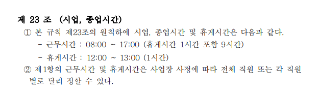올려드린 사진은 회사 내 취업규칙에 있는 시간에 대한 내용이고, 제 계약서에도 저녁 휴게시간은 따로 정해져 있지 않습니다.
