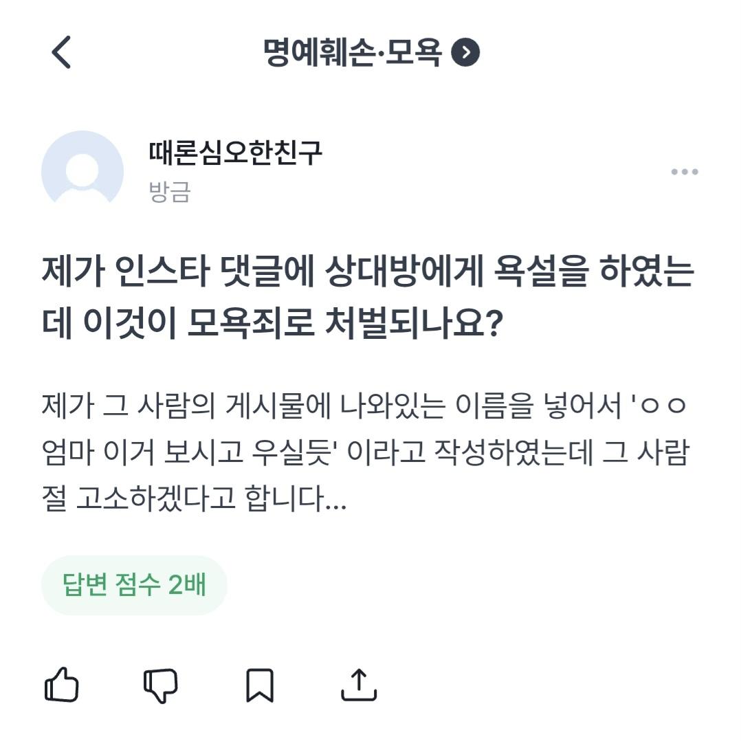 우선 사진은 제가 쓴 글이고요 저 사진에 나온 상황 이전에 제가 그 사람 댓글에 먼저 욕을 하였고 그 사람이 '니애미' 라고 답이 날아오자 제가 사진에 있던것 처럼 말을 한 상황인데 이러면 어떻게 되는건가요.....