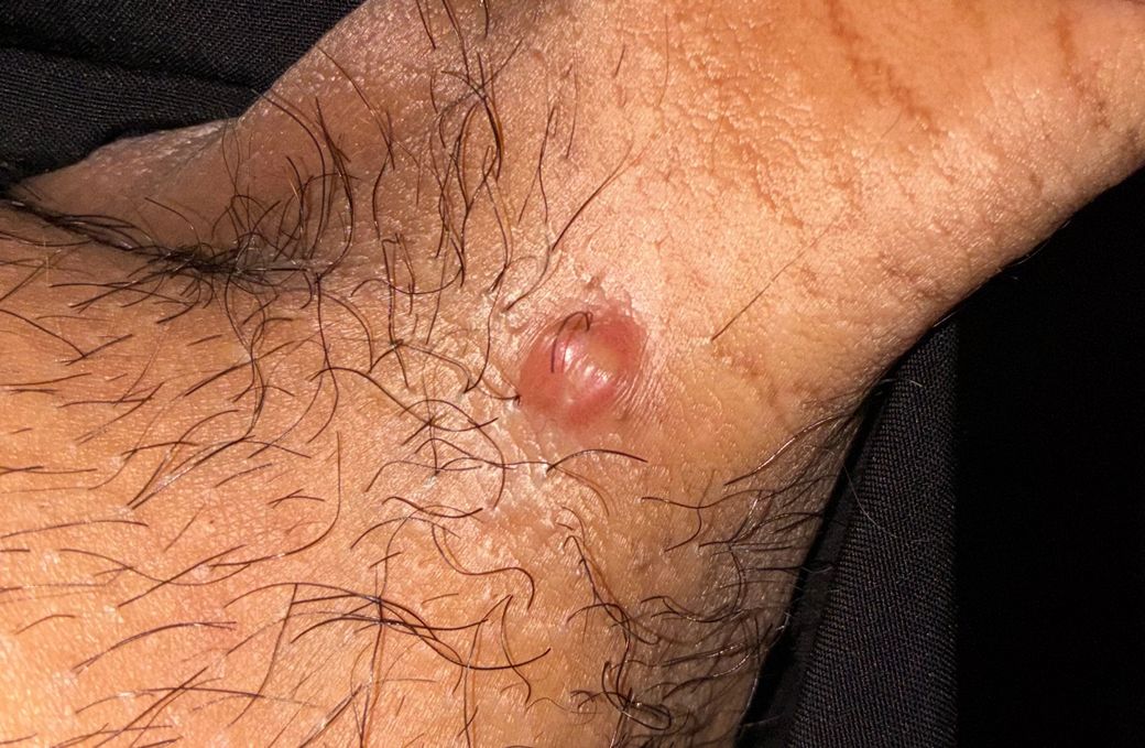 왁싱 후 발생한 작은 피부 손상에 세균 감염이 발생하면서 피하 농양이 발생한 것으로 보입니다. 이러한 농양은 절개 배농을 하거나 경구 항생제 복용이 필요한데 자가로 조치할 경우 이차 세균 감염의 우려가 있어 바람직하지 않습니다. 곤지름은 사마귀 양상의 결절성 양상으로 나타나는 것이 일반적이므로 상기 병변과의 연관성은 낮습니다.