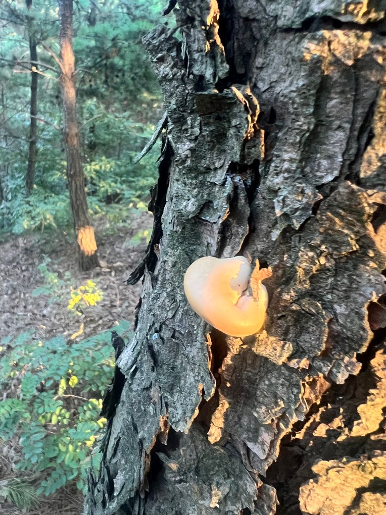 안녕하세요 동네 뒷산 등산하려고 올라왔어요 동네마실삼아 등산중인데 소나무에 갈려있은 이 버섯은 멀까요? 먹을수 있는건가요?
