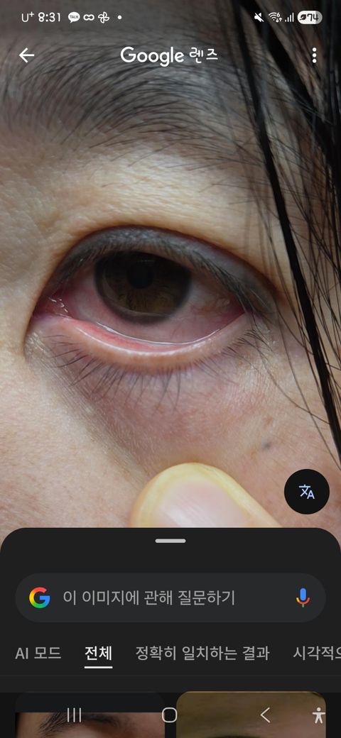 사진상으로는 결막(흰자 부분)에 충혈이 있고, 하안검 결막도 약간 붉어져 있는 상태로 보입니다. 분비물은 뚜렷하지 않고 국소 출혈보다는 전반적인 혈관 확장 양상에 가깝습니다.