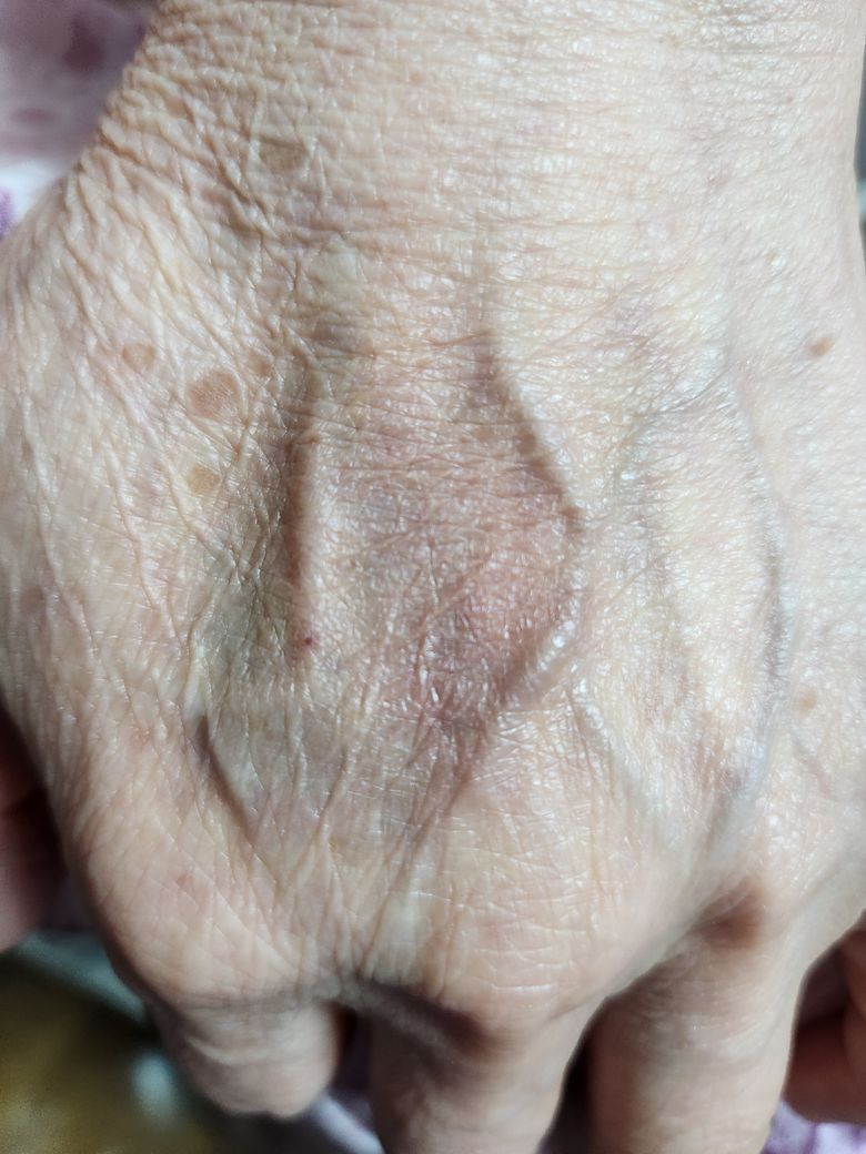 손등에 주사를 놓으려다가 실패한 부위에 혈관이 터져 속안에서 출혈이 난것입니다.