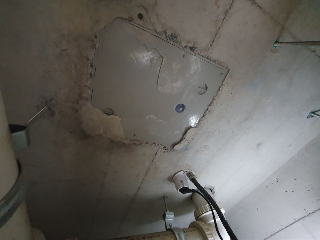2024년 9월부터 욕실 천장에서 물 떨어지는 소리가 들려 확인해 보니 욕실 천장(윗집 바닥부분)에 플라스틱으로 된 집수조 같은게 보이고 바닥부분이 깨져서 누수가 발견되어