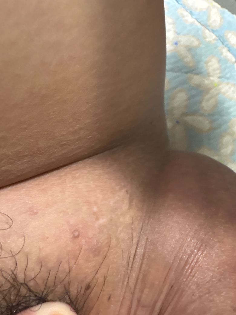 사진상 병변은 작고 둥근 단일 구진이며, 표면이 비교적 매끈하고 중앙이 약간 들어간 형태로 보입니다. 전형적인 곤지름(인유두종바이러스, human papillomavirus 감염에 의한 생식기 사마귀)은 표면이 거칠고 닭벼슬 모양 또는 여러 개가 군집하는 양상을 보이는 경우가 많습니다. 현재 사진처럼 단일, 매끈한 작은 병변은 모낭염, 피지선 구진, 혹은 전염성 연속종(molluscum contagiosum) 가능성이 더 높아 보입니다.