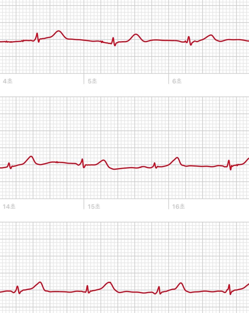 저는 상승부하강부가 작으며 거의 크기가 같게 나오면서 불규칙적으로 보이네요 이런 심전도 파형의 사람도 많나요