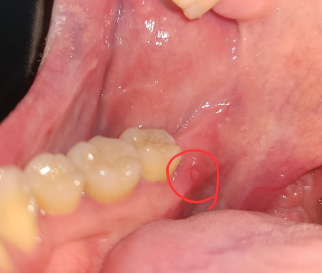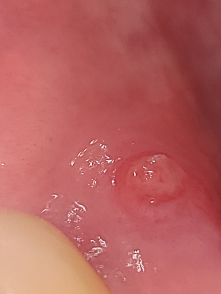 사진상으론 점액유출현상 또는 점액류(mucocele)가 의심됩니다. 주로 작은 타액선 배설관에 가해진 외상에 의해 발생하게 됩니다. 치료는 병소의 외과적인 절제입니다. 구강내과가 진료과로 있는 치과에 가서 정확한 진단을 받아보시기 바랍니다. 상기 말씀드린 내용은 사진만 보고 내린 잠정진단이며 정확하지 않을 수도 있습니다.