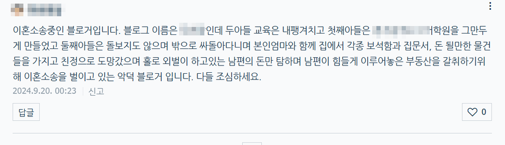 10월 초 저의 블로그에 저에대한 거짓된 정보 및 아이의 신상정보를 노출, 댓글을 달았습니다.