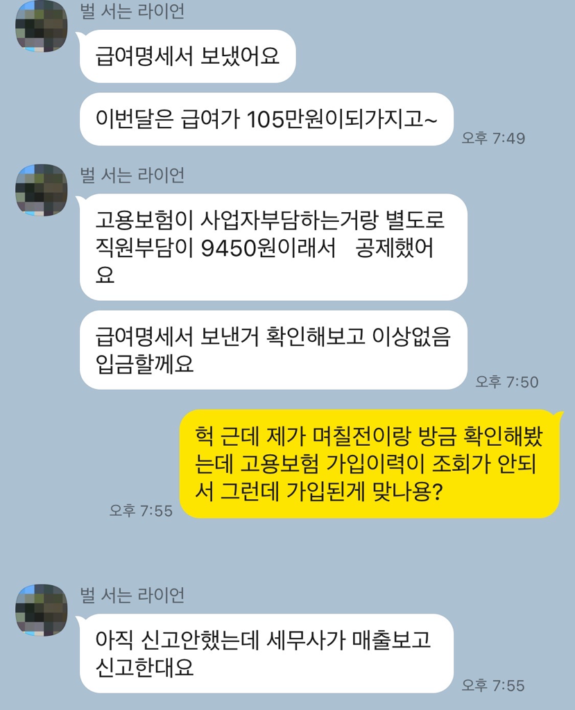 그러다가 먼가 이상해서 가입이력을 조회해봤는데 아무것도 안 나와서 전 글과 같이 가입된건지 물어보았고 안된걸 확인했어요 근데 오늘이 알바비 들어오는 날인데 고용보험 금액인 9450원을 빼고주신다길래