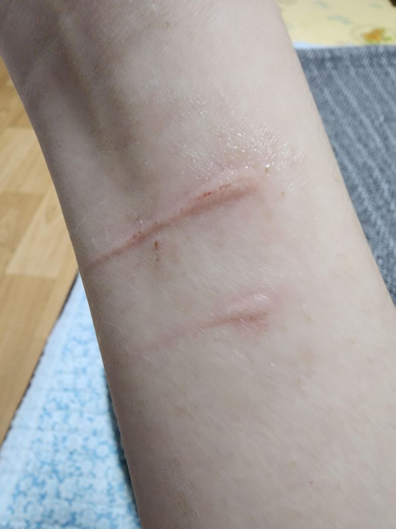 집 고양이가 제 팔을 물어서 팔이 사진처럼 됐어요. 물리자마자 흐르는 물로 씻고 후시딘을 발랐는데 병원에 가야 할까요?ㅠㅠ.. 그냥 둬도 될까요
