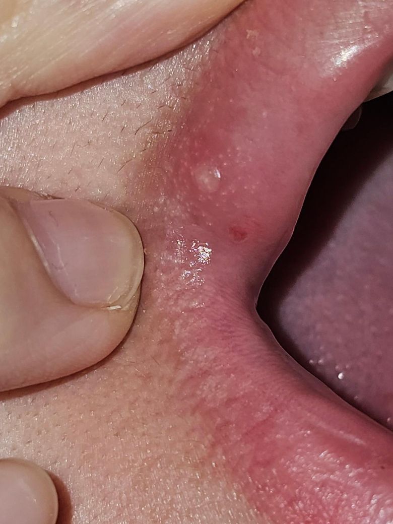 어제부터 입꼬리쪽이 살짝 욱신하길래 봤더니 안쪽 점막에 동그랗게 뭐가 만져지더라구요. 손으로는 잘 모르겠는데 혀로는 2개 만져졌구요, 지금 2번째 사진처럼 하나는 터진? 상태인데... 헤르페스일까요?