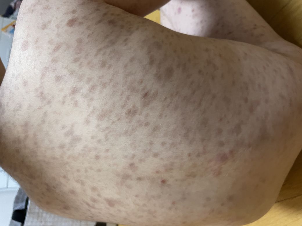 현재 발진 양상을 보면 장미색 비강진의 가능성은 있습니다. 비강진은 수주에서 12주까지 지속될 수 있으며 색소 침착을 남길 수 있고 대증적인 치료법을 통해 치료합니다. 하지만 증상이 오래 지속되었고 전신에 색소 침착등이 심하므로 정확한 진단 및 처방을 위해 내원하시어 진료를 보시는 것이 좋겠습니다.