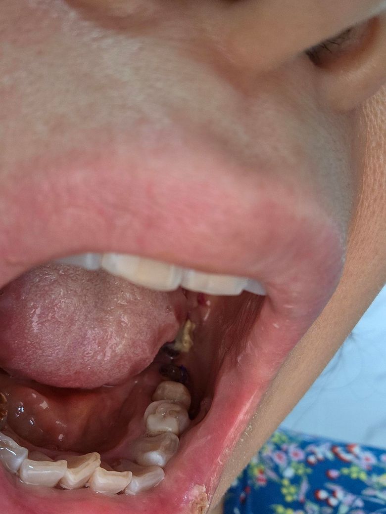 사진상 보기로는 이물질 같습니다 수술부위 뒤쪽이기도 하고요 해당 부위 피가 안난다면 살살 양치해보세요