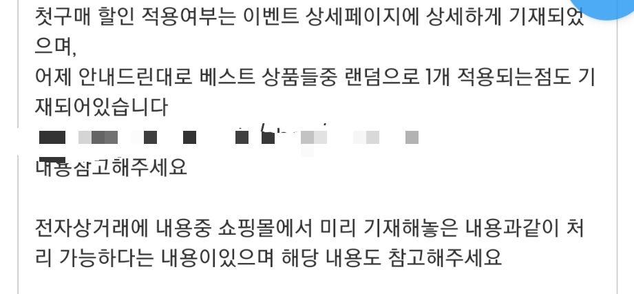 하지만 고객센터 통화시에는 담당자가 상품에 반값할인은 랜덤으로 적용되었고 그게 하필 제가 반품하려던 원피스라고 하더군요. 또한 상담 답장에서도 랜덤으로 기재되있다고 답변이 왔습니다.