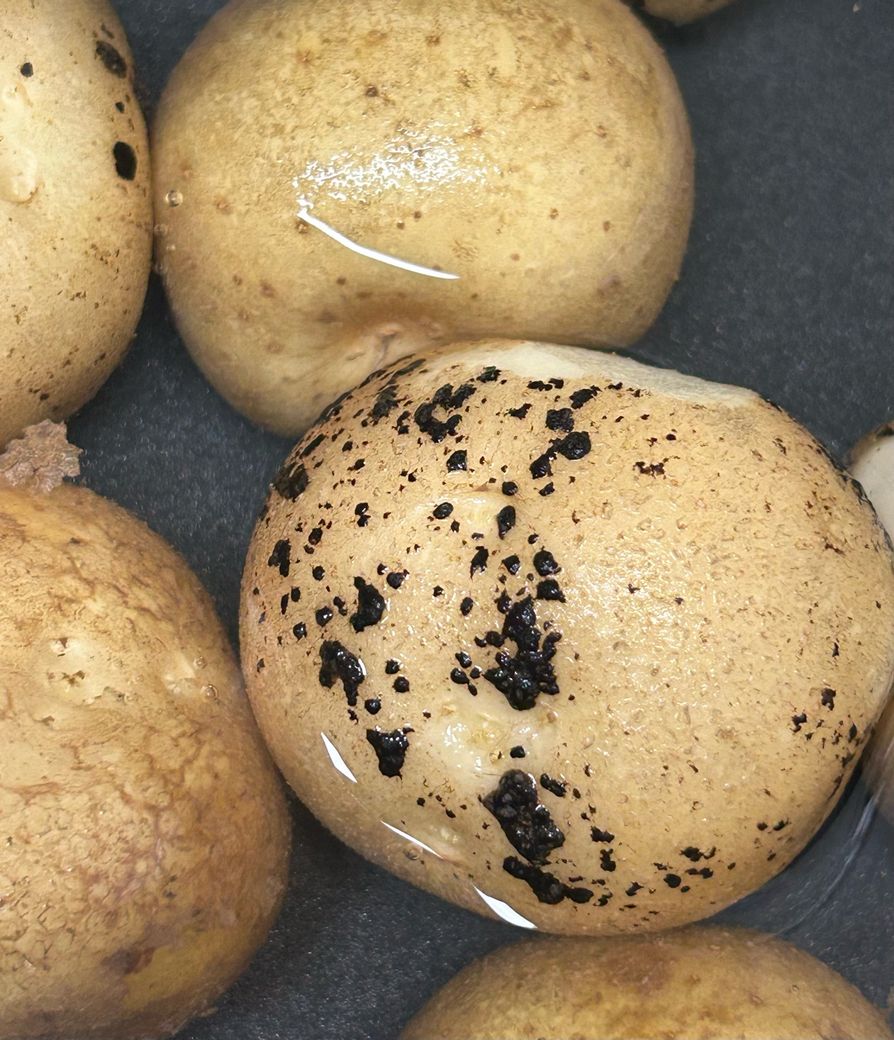 안녕하세요. 사진 속 감자 표면의 검은색 덩어리는 감자 검은무늬병 증상으로 보입니다.