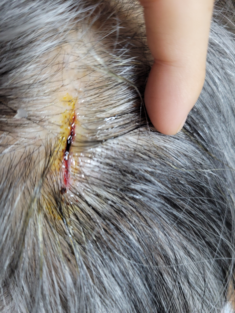 봉합 혹은 드레싱이 필요한 상처로 보이니 병원 방문해보시는 것이 좋겠습니다. 증상이 없다면 가능성은 적으나 뇌출혈, 골절 등을 확인해보기 위해서는 머리 CT 를 찍어보아야 하니 주치의 선생님과 상의 후 결정하세요.
