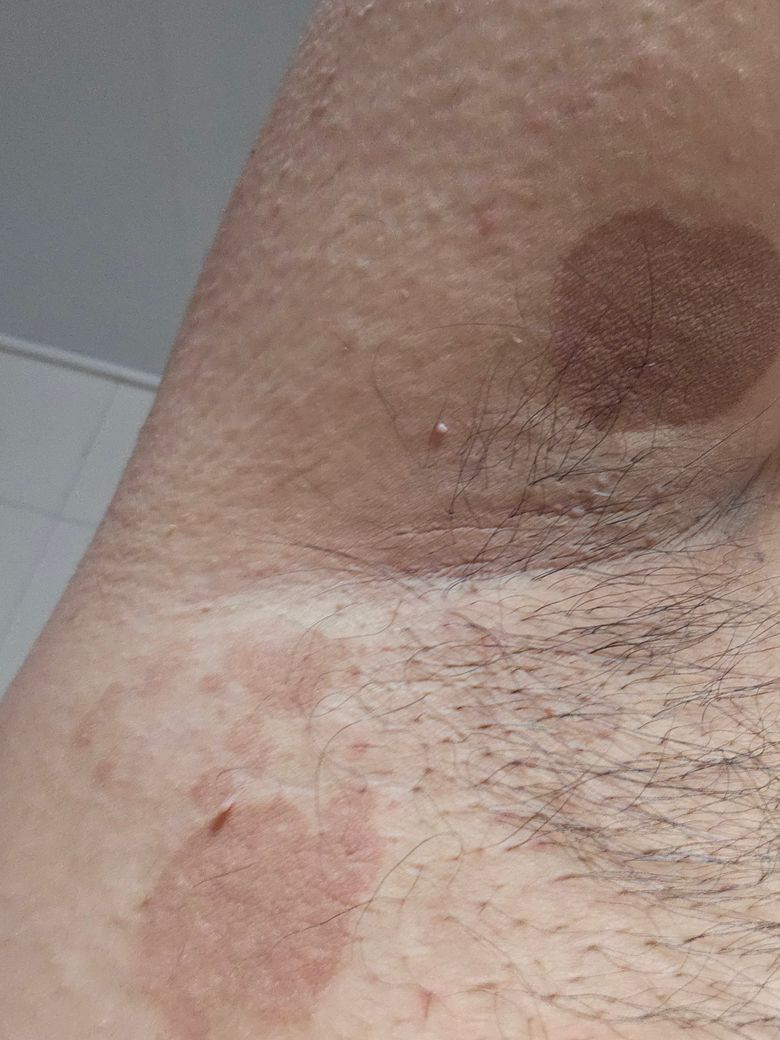 겨드랑이 부위로, 샤워하다가 위 아래 반점들을 발견했는데 통증이나 가려움도 없어서 전혀 모르고 있었습니다.