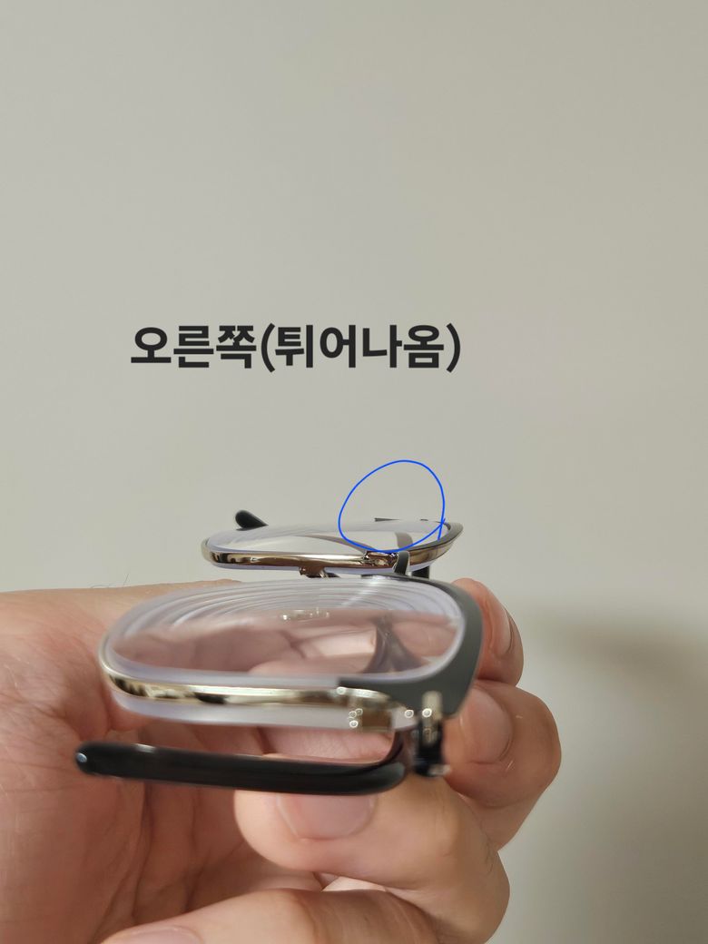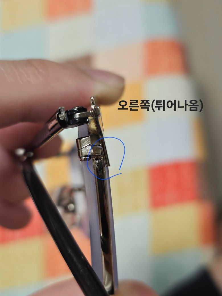한달전에 안경수리를 맡겼다가 2주전에 받았습니다. 근데 안경 배송지를 본가로해놔서 이제서야 확인을 해보니 썼을때 뭔가 안경 다리 높낮이가 안 맞는 듯이 불편하더라고요. 그래서 어디가 잘못되었나 찾아보는데 오른쪽 태 부분이 사진과 같이 튀어나와있더라고요. 이부분이 잘못 결합되어서 높낮이가 안맞나 싶기도하고 불량같아보여서 마음에 들지않습니다. 수리비도 4만원 정도 내고 수리했는데 불량으로 보고 무상으로 재수리를 요청할 수 있나요?