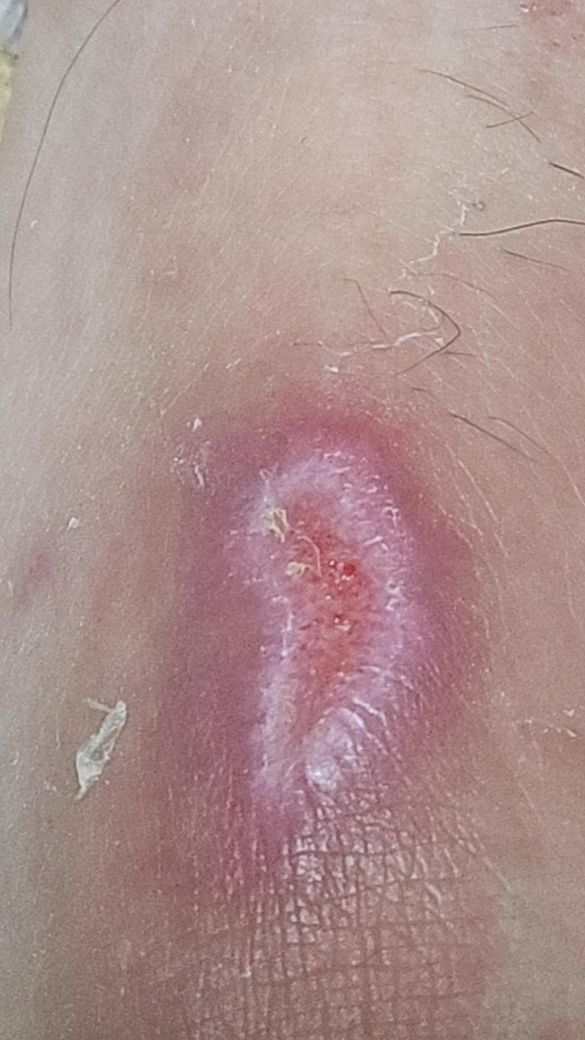 발생시기는 2주전이고 사진은 1주전과 오늘입니다. 상처는 거의 아문것인지 지금 연고와 습윤드레싱중인데 연고랑 습윤드레싱만으로 치료해도 되는지