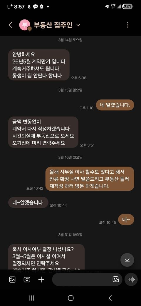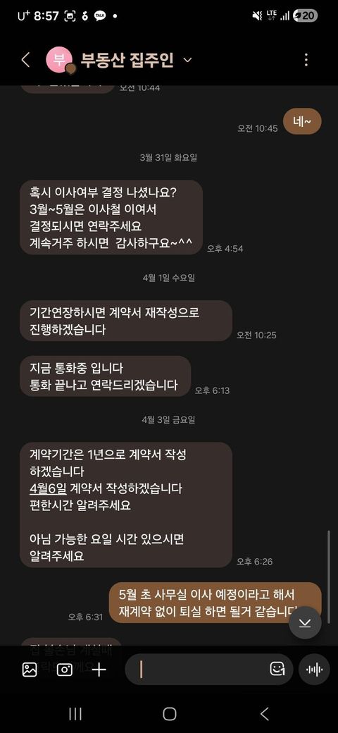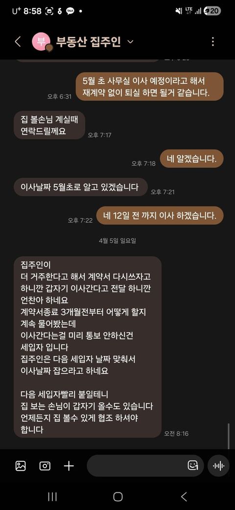 제가 26년 5월 14일 만기 일인데 집주인 분께서 2개월 전에 재계약 이야기를 하셨고 저는 이사 날짜가 안 잡혀 애매해서 좀 더 있다가 정해지는 날 바로 4월 3일 집주인께 확답을 드렸습니다. 집주인께서는 이렇게 말씀하시고 3개월 전쯤부터 이야기하셨다는데 3개월 전쯤 전화 통화나 문자 대화가 없었습니다. 제가 몇 월까지 월세 내고 나갈 수 있는지 집주인께 설명할 이유 도움받을 수 있을까요..?