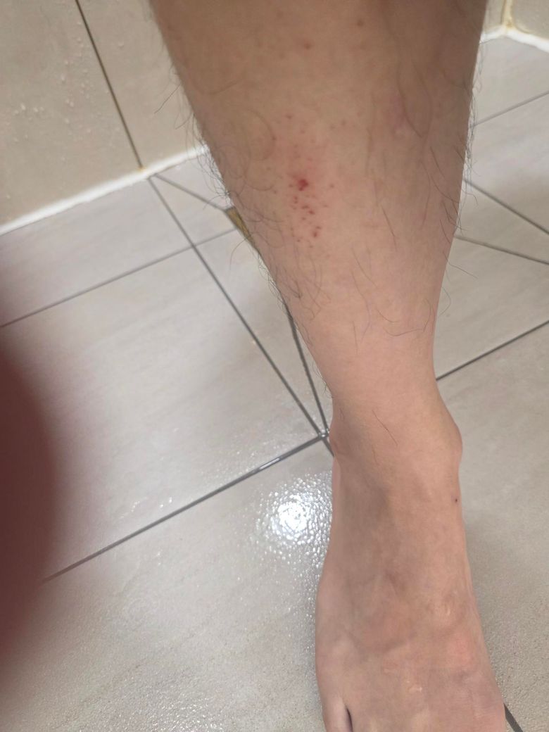 갑자기 종아리기 아래와같고 눌러도색이변하지는 않아요 글고 누르면따가워요..