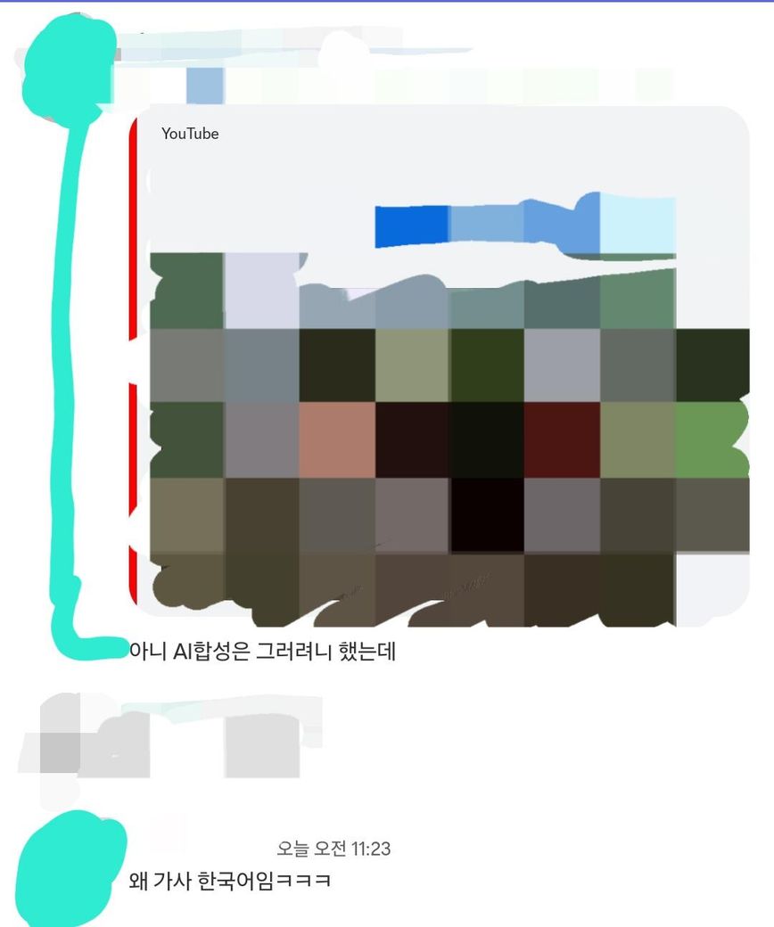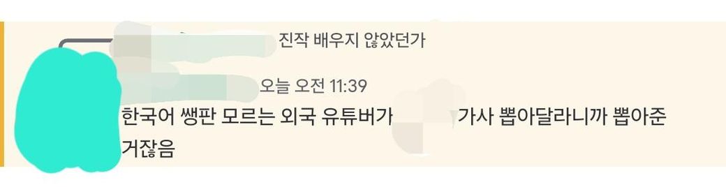 세번째 사진에서 '한국어 쌩판 모르는 외국 유튜버가 @@@ 가사 뽑아달라니까 뽑아준거잖음'