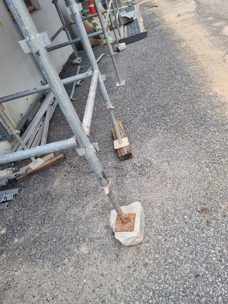 이 경우 산안법 위반인지, 그리고 그런 이유가 궁금합니다. 산안기준규칙 70조 밑받침철물 관련 규정이 나오는데, 저렇게 조립된 상태에서 "조절형 믿받침 철물"로 갈아끼울 수 있는지도 궁금합니다