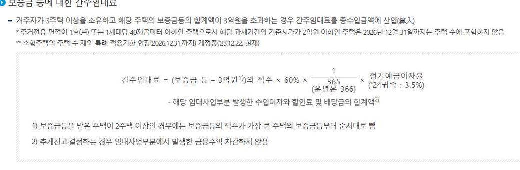 거주자가 3주택 이상을 소유하고 해당 주택의 보증금등의 합계액이 3억원을 초과하는 경우 간주임대료를 총수입금액에 산입(算入)
