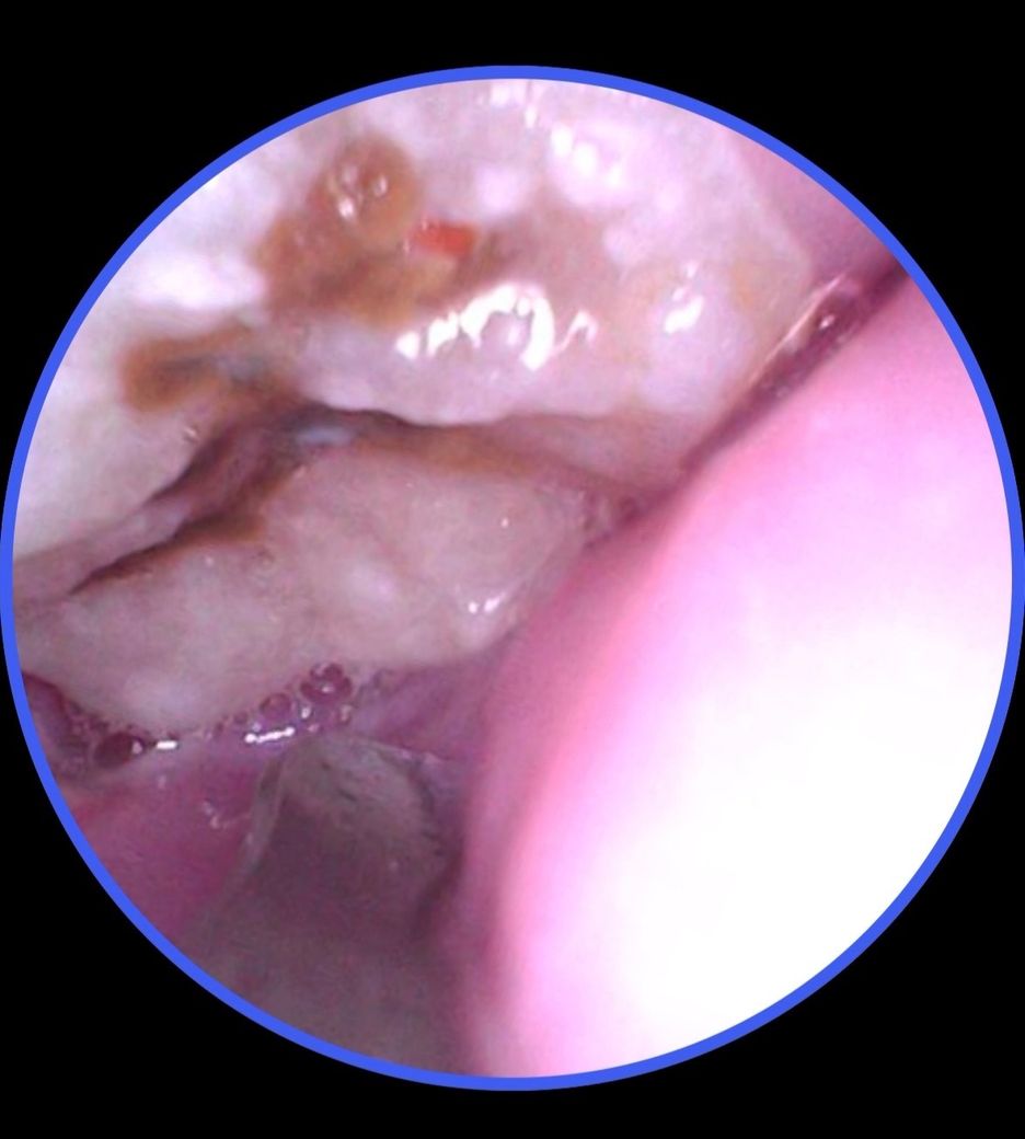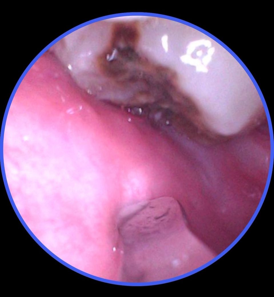 최근 내시경으로 확인 후 심하게 갈색으로 변색되어 걱정되시겠어요 엑스레이를 찍지 않아 정확하지 않으나 육안상 판단시 충치의 깊이가 아직 신경을 침범하지 않은 충치라서 통증이 없으신거 입니다 지금처럼 칫솔이 닿는 부위까지 잇솔질을 하시면 충치가 급속하게 진행 되지 않을 것이니 시간 되실때 치과 방문 후 발치 하시면 될 거 같습니다 너무 큰 걱정은 안 하셔도 됩니다