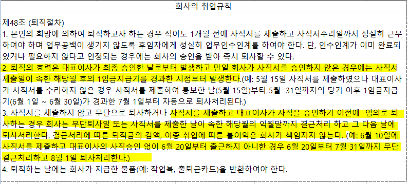 이를 회사에서 퇴직일자를 근로자가 희망한 일자가 아닌 첨부한 취업규칙처럼 조정할 수가 있는건지 궁금합니다.