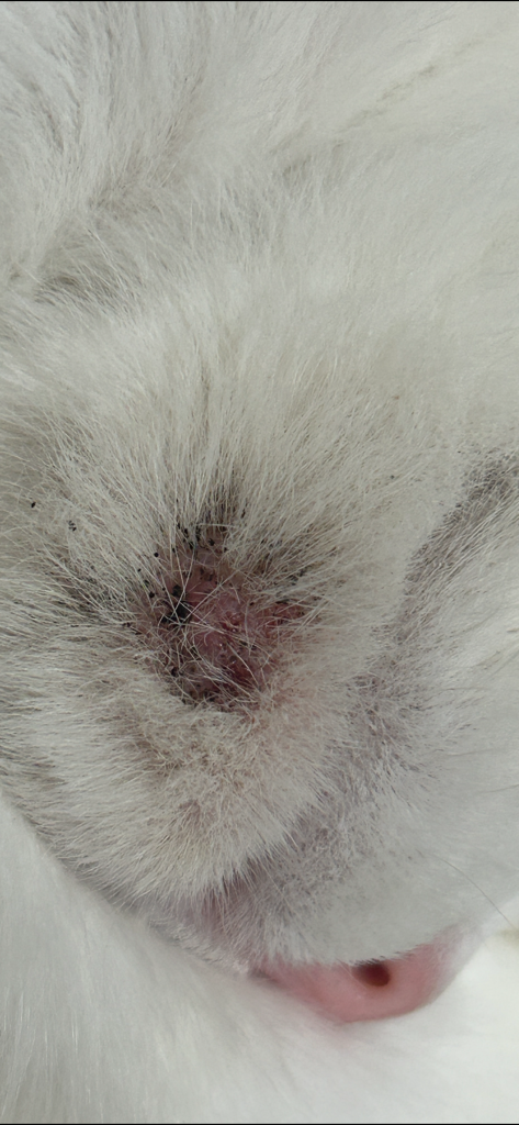 고양이 여드름이라는 피부 질환일 가능성이 높습니다. 고양이 여드름은 턱에 까만 여드름이 보이거나, 피가 나서 염증이 생기는 증상을 보입니다. 주로 턱에 많이 생긴다고 턱드름이라고도 하는데 턱 말고도 다른 부위도 생길 수 있습니다. 턱에 묻은 사료나 사료의 기름기가 원인일 수 있고, 아토피, 호르몬, 알레르기 등이 원인이 될 수 있습니다. 그런데 다 큰 성묘가 평소 여드름이 나지 않다가 갑자기 나는 경우에는 대부분 알레르기 반응일 가능성이 높습니다. 그래서 어떤 원인 때문에 알레르기 반응이 났는지 잘 살펴 봐야 합니다. 초기에 까만 여드름일 경우에는 집에서도 충분히 적절한 관리로 치료가 가능합니다. 따뜻한 물수건으로 턱 주위의 피부를 찜질해주시고 불려진 피지들을 깨끗한 거즈나 패드로 닦아주세요. 소독약 등 전용 케어 제품을 사용하는 것도 좋습니다(사람용 연고 발라주셔도 됩니다. 에스로반 가능)