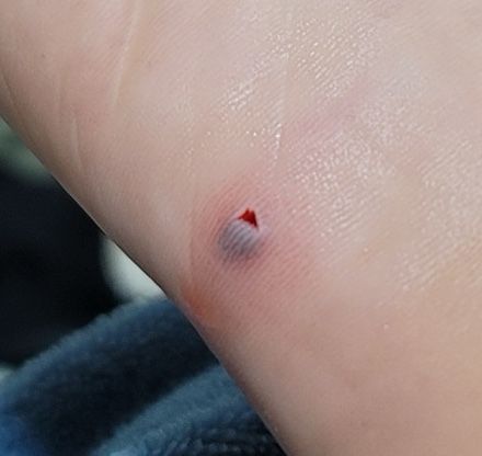 무언가에 의해 멍이 들고 상처가 났는데, 우선은 연고 바르며 상처가 회복하길 기다려보실 수 있겠고 만약 이물이 박힌 상황이라면 염증반응이 국소적으로 나타날테니 이 때는 피부과나 정형외과를 방문하시기 바랍니다.