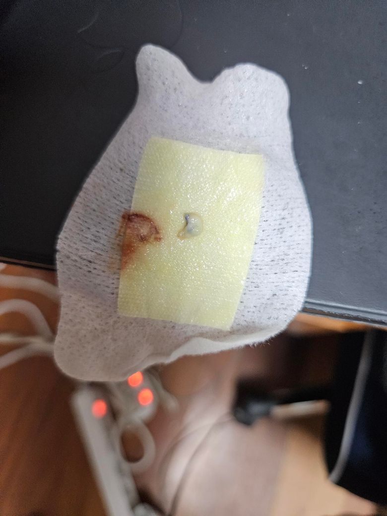 수술햇다가 지방종 염증생겨서 한번터지고 항생제치료후 재봉합 한지 2주되엇는데요 전보다 피고름양 통증은 줄긴햇는데 계속꾸준히나와서 하루 2번드레싱해주는데 오늘 보니 이정도피가나오고 초록생 고름같은게사진과같이나왓는데 이게 염증덩어리가 배출되는정상적인과정이낭노