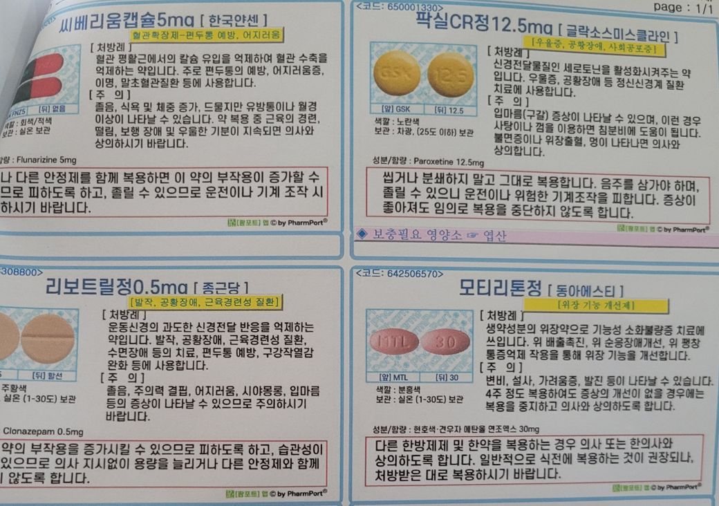 나리펜 . 모티리톤. 환인클로나제팜0.5(반알) . 파록스씨알정12.5 (반알) 이렇게 먹고있는데 기존 병원이 멀어 가까운병원에서
