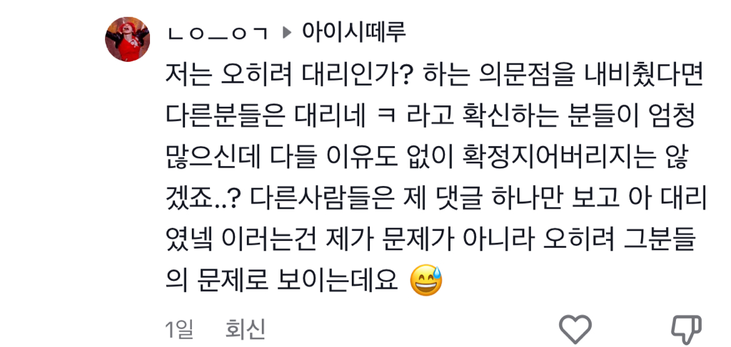 다만, "대리인가"라는 내용은 단순한 의견을 표시한 것으로, 사실을 적시했다고 보기 어려워 명예훼손죄, 모욕죄 성립가능성은 낮아 보입니다.
