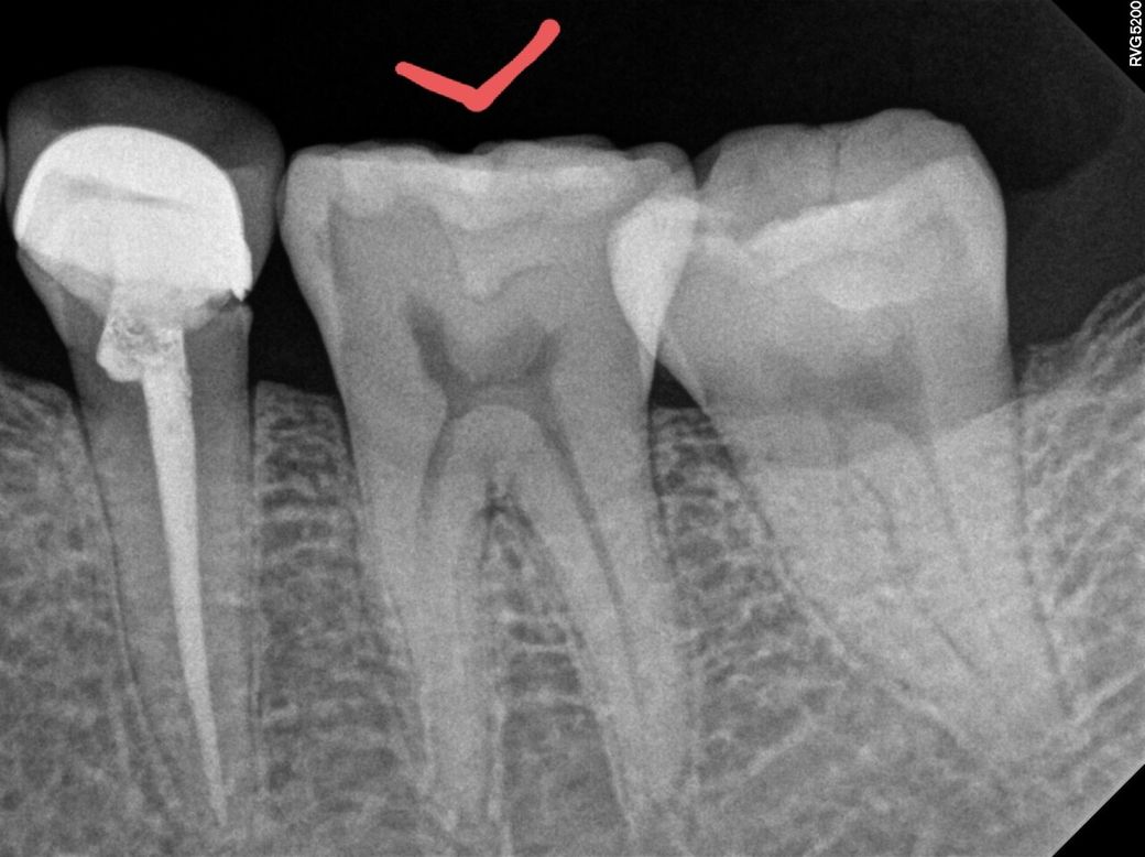 사진상으로 보면 어금니 사이에 충치가 있는것같습니다. 일반적으로 사이에 충치가 있다면 인레이치료를 하게 됩니다. 증상이 있으셔서 제거해봐야 알겟지만, 인레이 치료는 신경치료 가능성이 있습니다. 치료를 받으시긴 받으셔야될것같습니다.