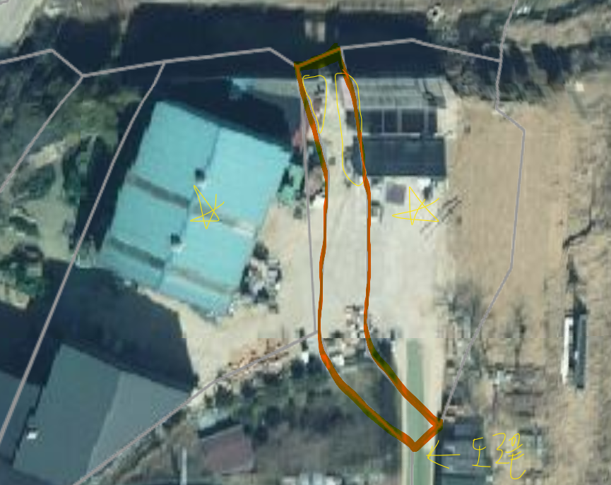 실제로 왼쪽에 가건물의 모서리 끝이 국유지에 걸려있고, 오른쪽은 차양이 설치(노란색 동그라미)되어있습니다.