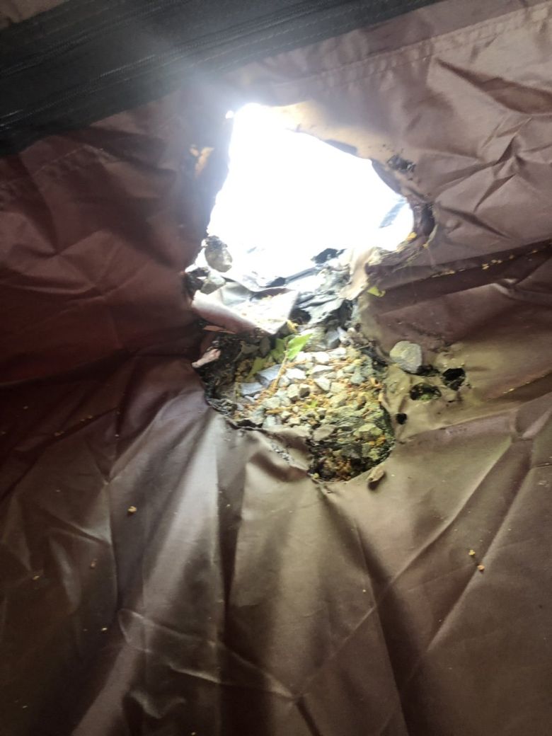 캠핑장에 텐트를 쳐 놓은 상태에서 잘려고 보니 텐트가 불에 녹아 구멍이 난것을 확인하였습니다.