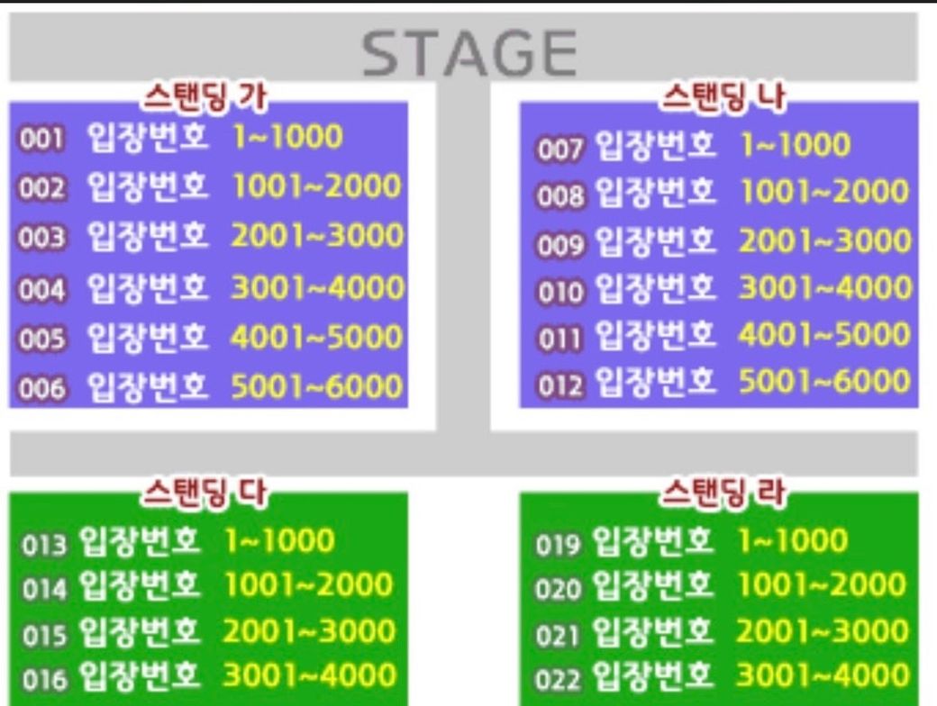 아시겠지만 번호는 입장 순서고 어차피 스탠딩이라 오른쪽 왼쪽 나뉘게 되는데 화장실과 가까운 방향이라던지 그런것만 확인 해보고 고르시면 됩니다. 그게 아니라면 공연 즐기는데 있어서 위치는 정말 차이 1도 없어요